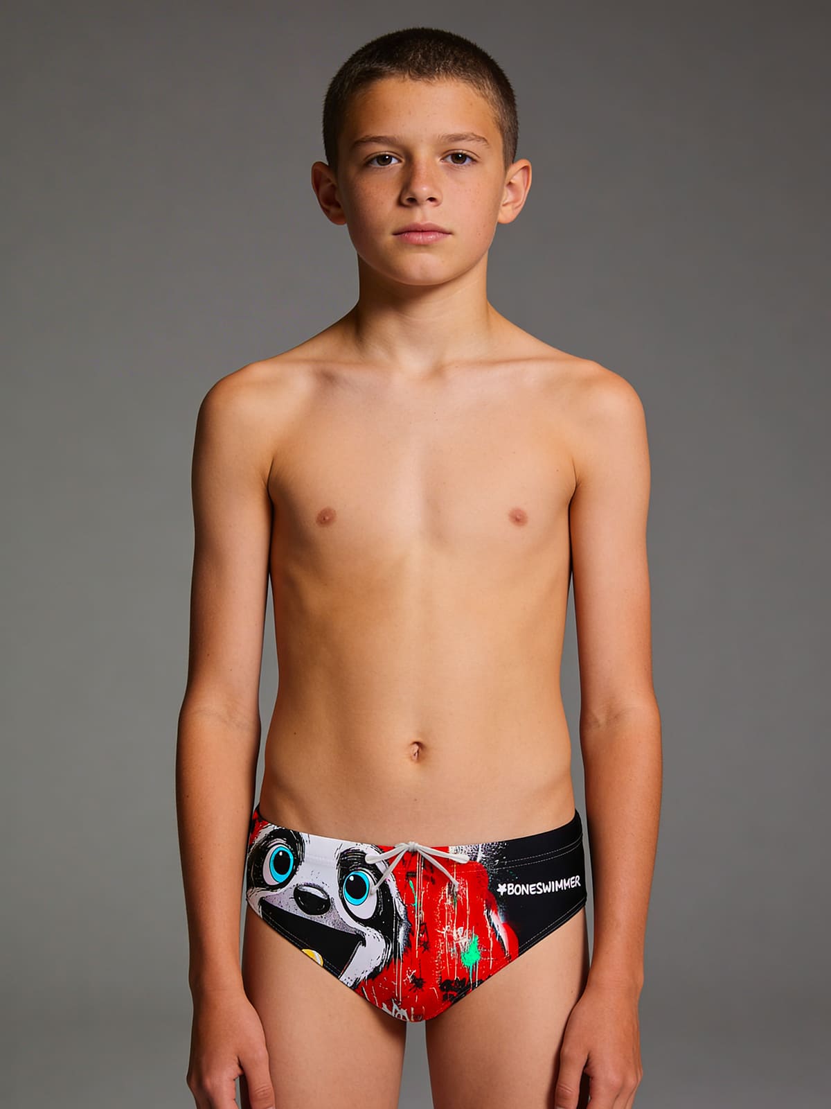 Trainings-Slip-Badehose, Modell H2otto. Aufdruck „Bradipo“: ein niedliches, lächelndes Faultier vor mutigem rotem Hintergrund und schwarzen Graffiti.