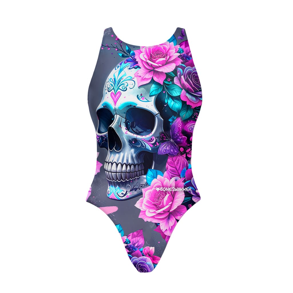 Training one-piece swimsuit, Pinup model. "Greyskull" print: glamorous and urban dark romantic style, skull with pop roses, contemporary street art.