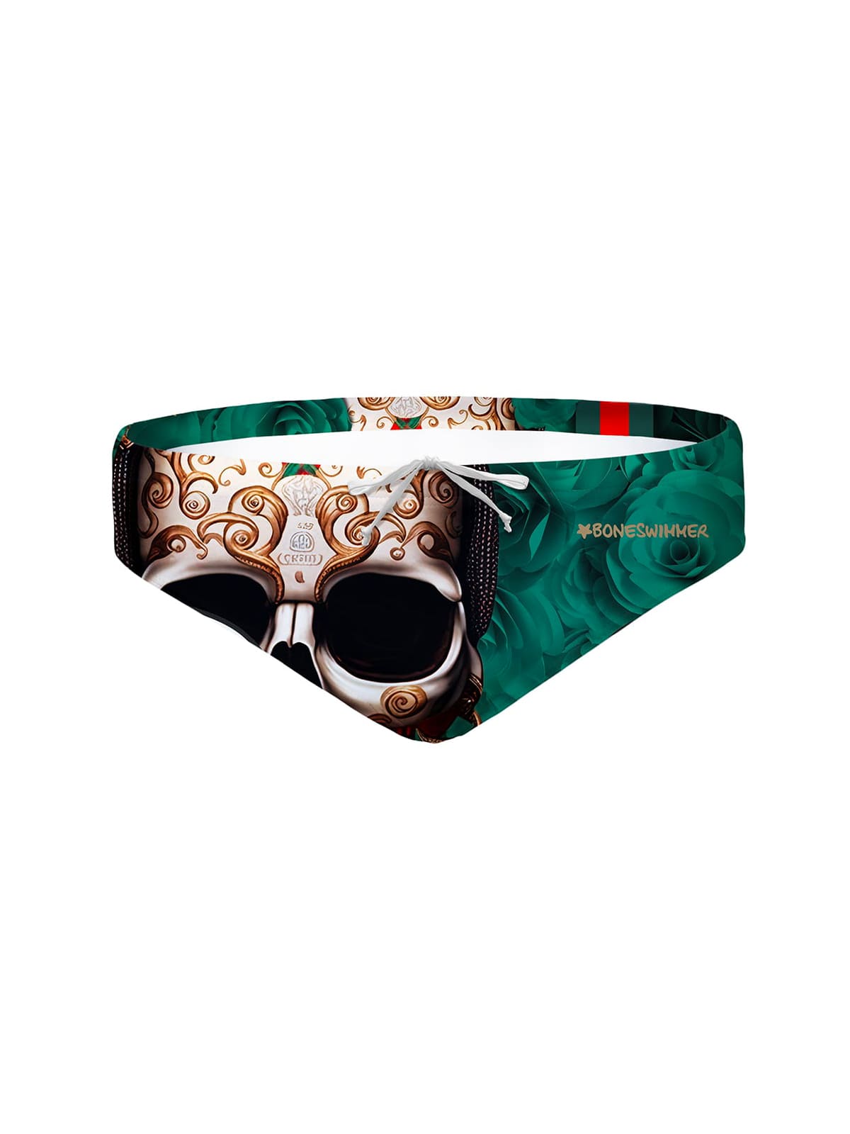 Print: a skull decorated with gold details on a dark green rose background, enriched with a tricolour accent, for a refined and enigmatic style.