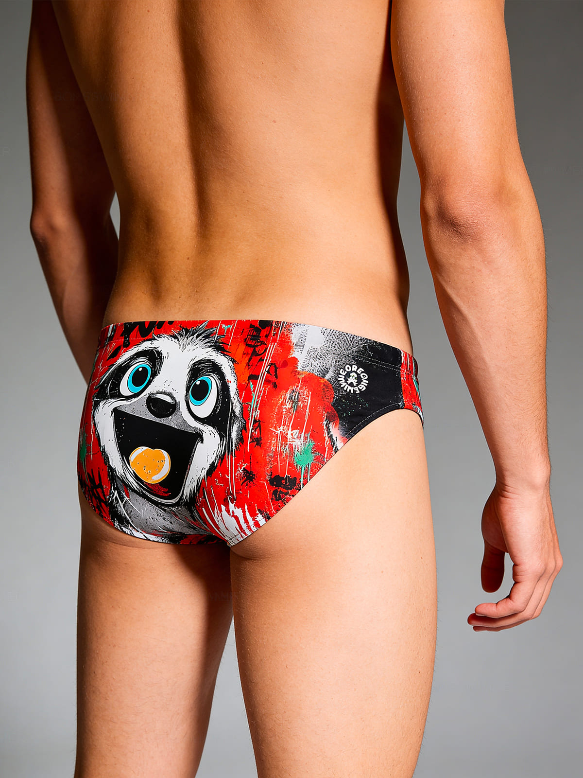 Training brief swimsuit, H2otto model. “Bradipo” print: a tender smiling sloth, bold red background and black graffiti.