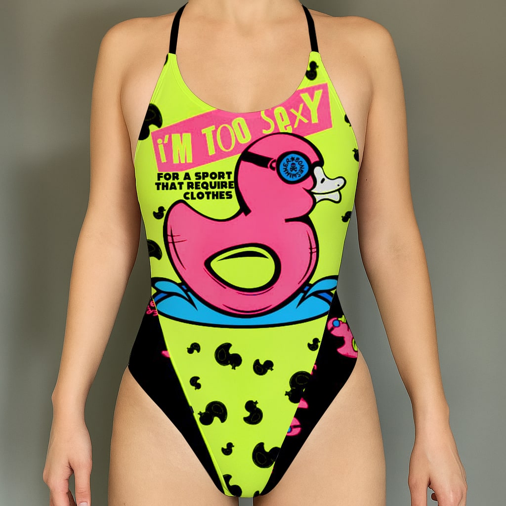 Style : Le maillot de bain DUXY se distingue par son design ludique, orné d’un grand canard rose au centre et du slogan « Je suis trop sexy pour un sport qui exige des vêtements ». Ce modèle se démarque par son motif original, qui allie humour et couleur dans une pièce conçue pour celles qui souhaitent affirmer leur personnalité, même à la piscine. Sa coupe échancrée flatte la silhouette féminine, rendant ce modèle idéal aussi bien pour le sport que pour une tenue décontractée.