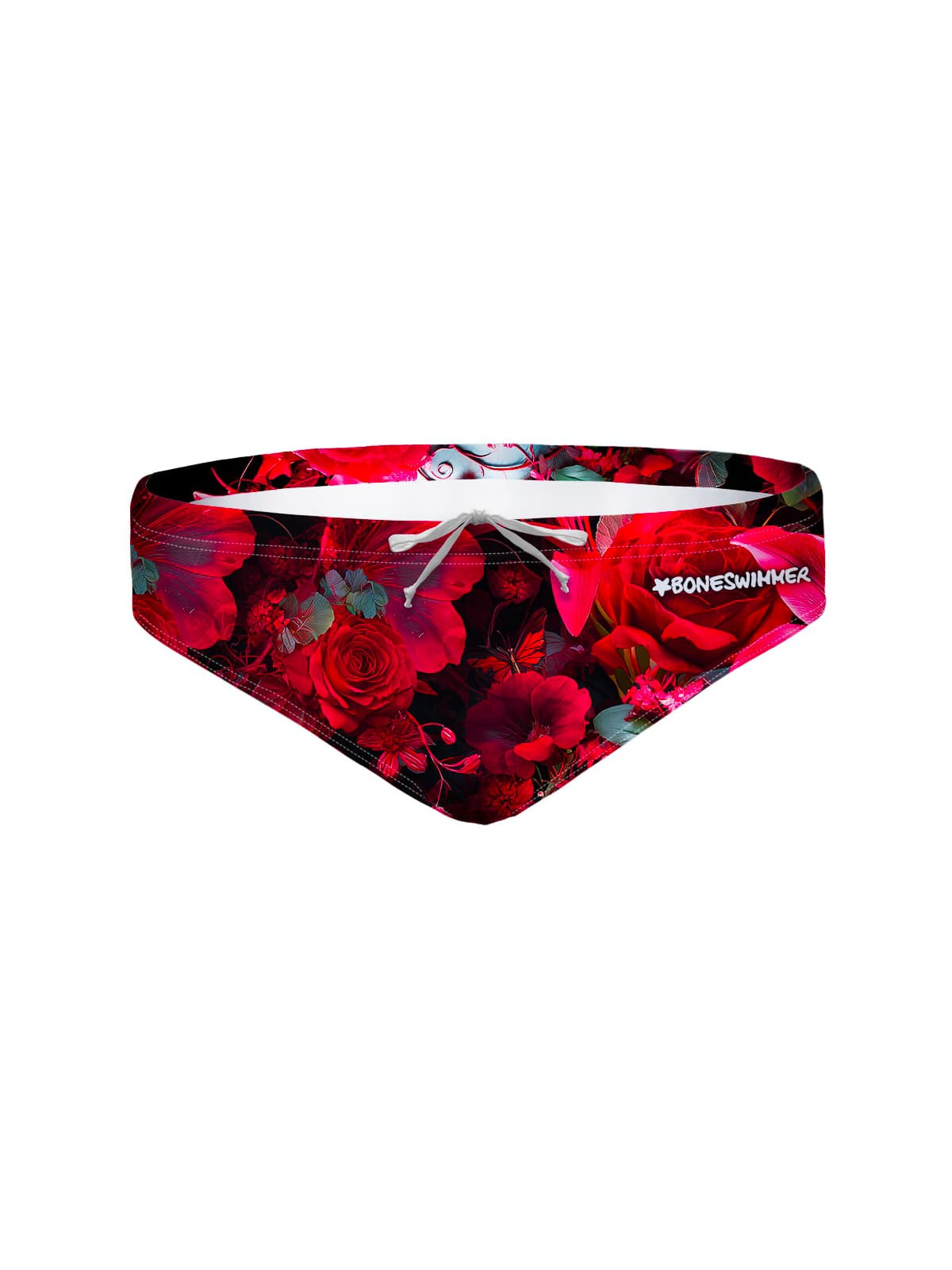 Slip de natation H2Otto. Imprimé « Crâne Cramoisi » : un crâne cramoisi émerge des ténèbres, symbole de défi et de ténacité. Un design percutant pour celles et ceux qui n'ont pas peur de repousser leurs limites dans l'eau.