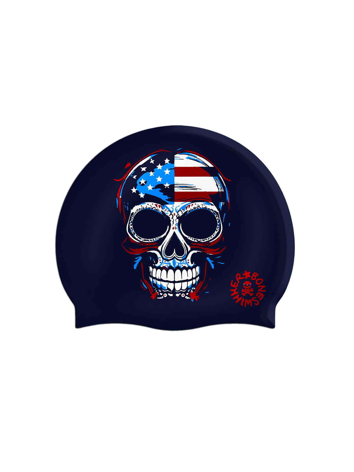 Impression : Un crâne enveloppé dans un drapeau américain se détache cruellement sur un fond bleu marine, comme un avertissement à vos adversaires à la nage.