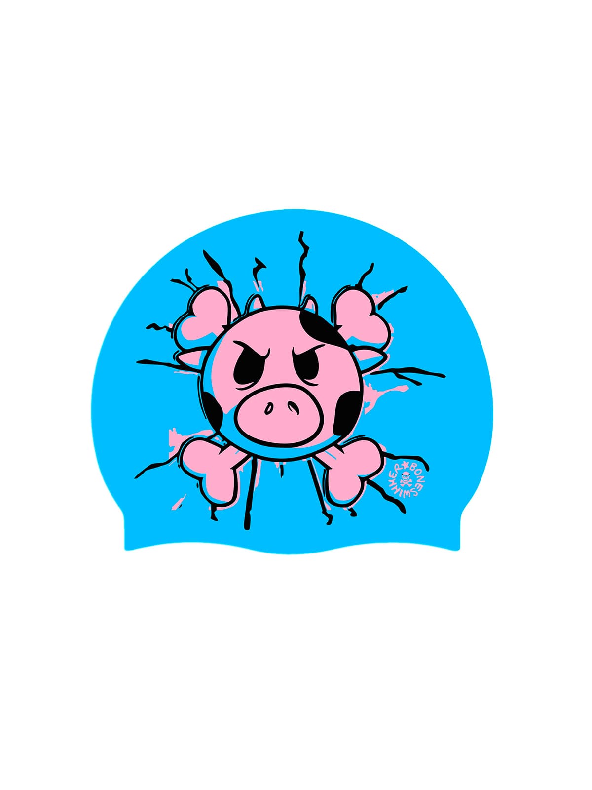 Style : L’illustration, résolument dynamique et pleine de vie, se détache sur un fond bleu vif. Elle met en scène une adorable tête de vache rose à pois noirs, stylisée et ludique, évoquant un crâne de pirate. Les détails noirs et les traits épais accentuent le contraste et créent un effet d’« explosion » derrière la silhouette, insufflant énergie et dynamisme au design. Le rose et le bleu forment un équilibre chromatique captivant, idéal pour celles et ceux qui recherchent un accessoire de natation original avec une pointe d’ironie.