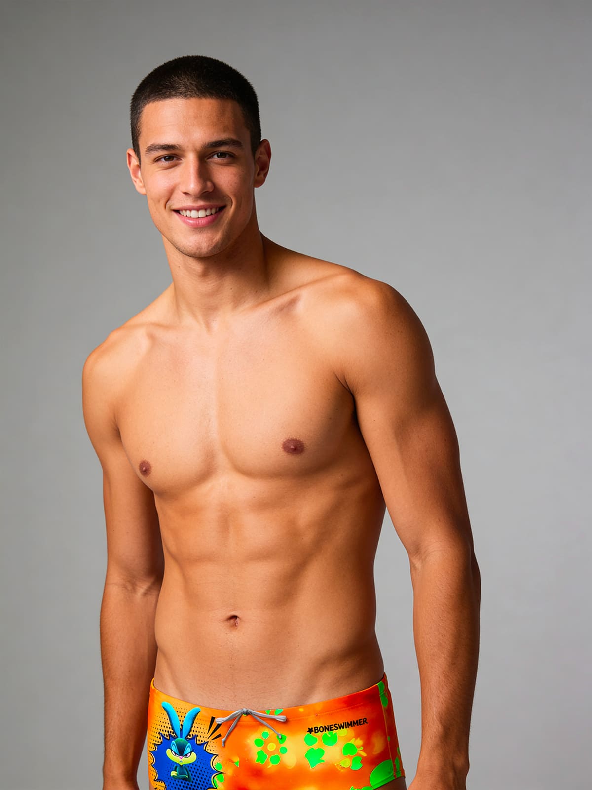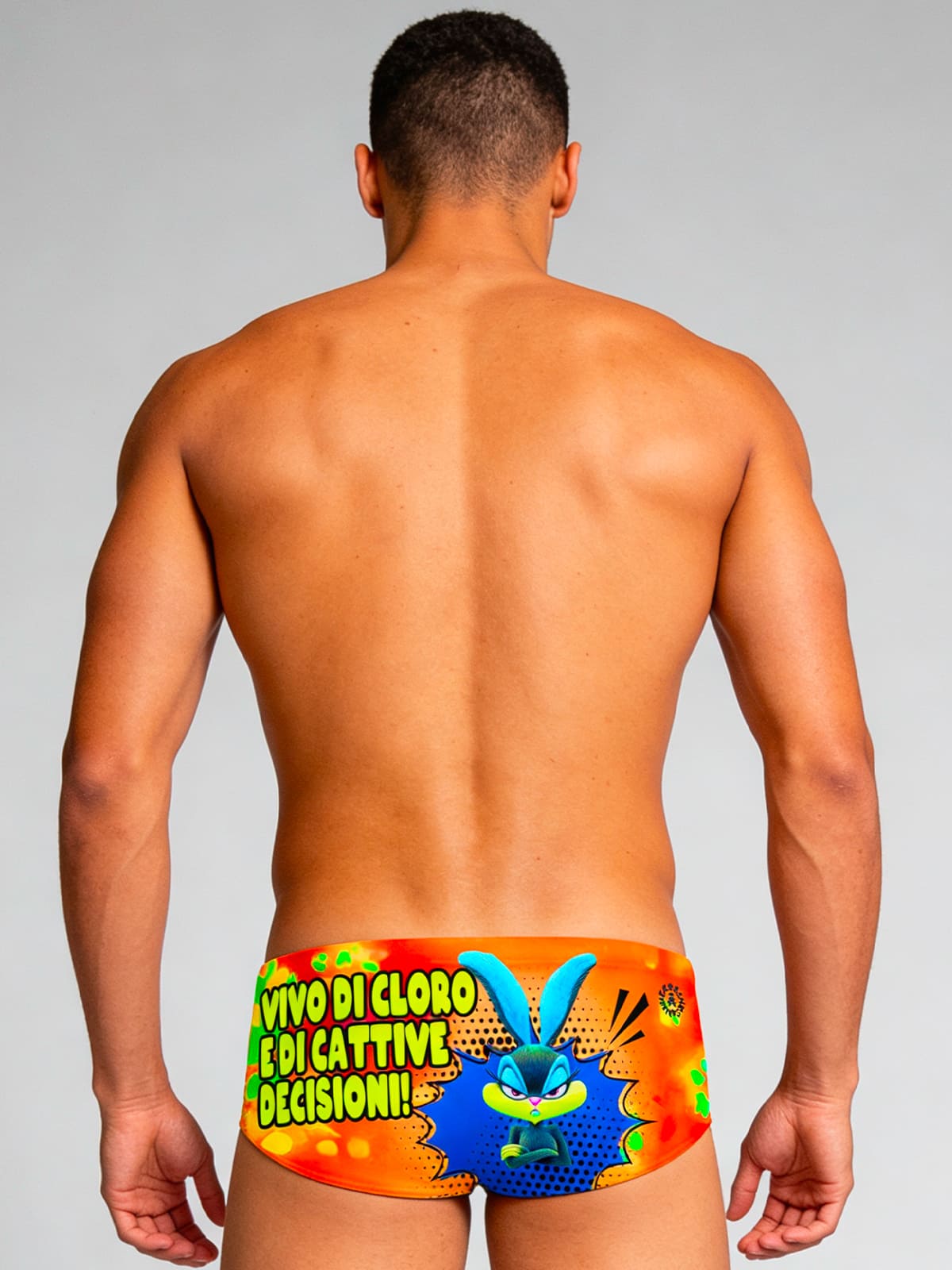 Maillot boxer d'entraînement, modèle Ucla. Imprimé « Bunny » : lapin style pop, avec une phrase jaune fluo irrévérencieuse et ironique.