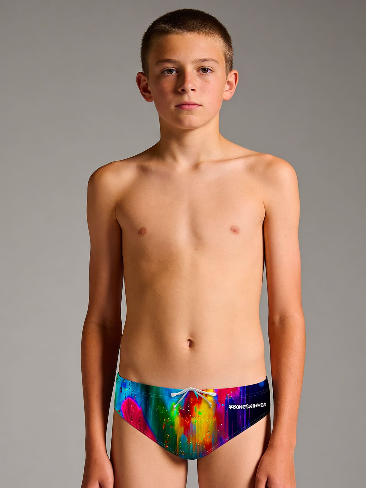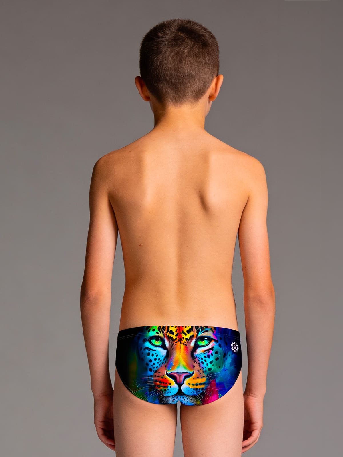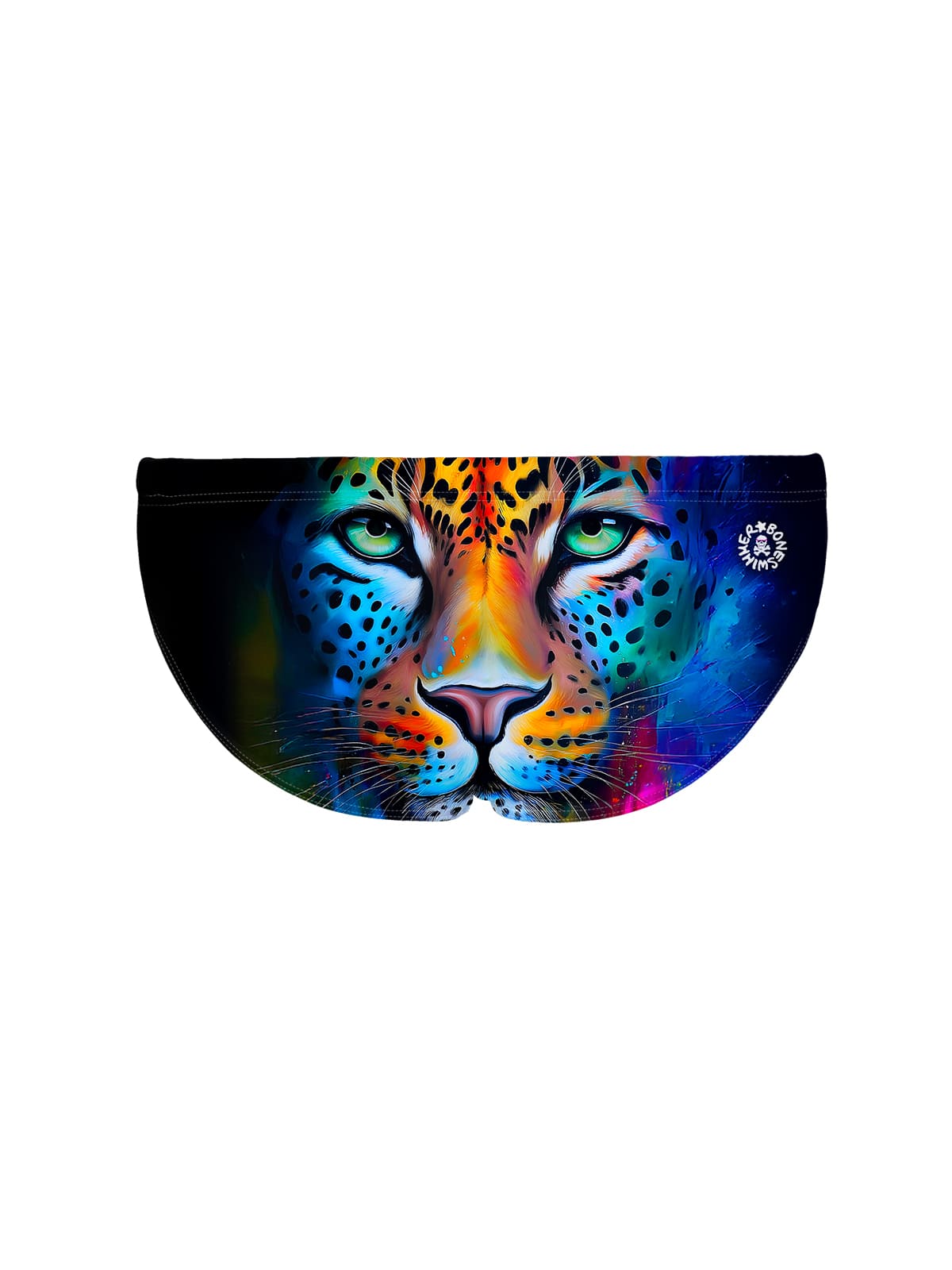 Maillot slip d’entraînement, modèle H2otto. Imprimé « Tache » : léopard au regard intense, taches de peinture fluo acide, couleurs vibrantes.