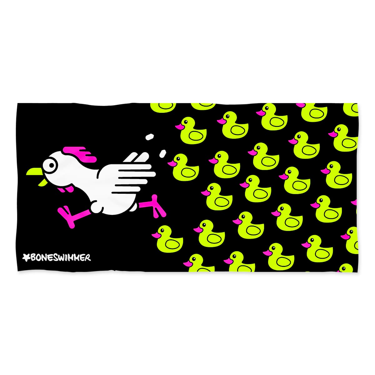 Style : Des graphismes ludiques et minimalistes sur fond noir, représentant des canards jaune fluo poursuivant un coq de dessin animé en fuite : l’effet est dynamique et amusant, avec un fort contraste de couleurs qui amplifie la sensation de mouvement et la narration visuelle. Les produits de cette gamme apportent une touche de légèreté à la piscine, avec une pointe d’autodérision et un message espiègle qui ne passera pas inaperçu.
