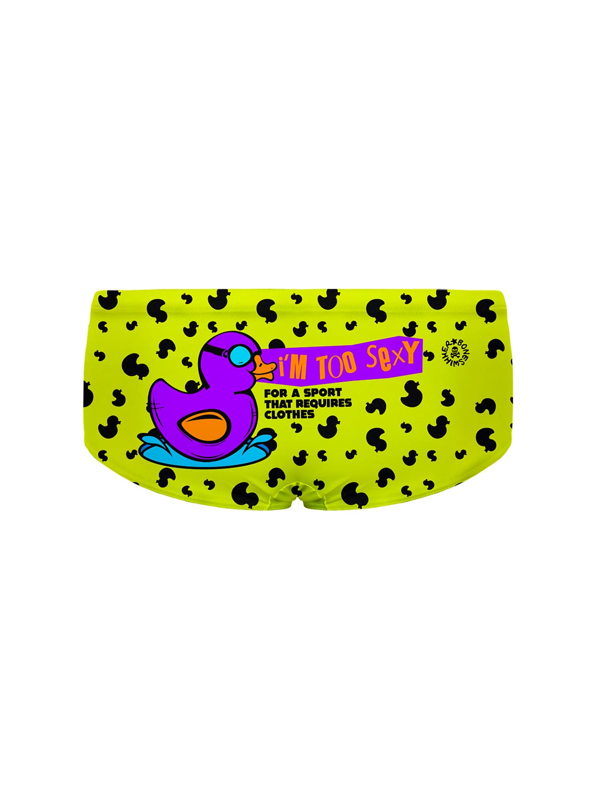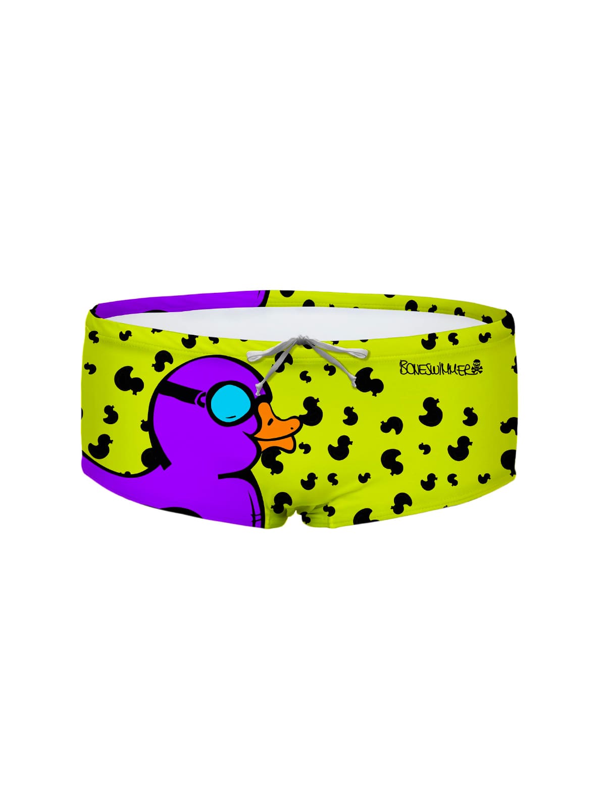 L'imprimé « Duxy » est une explosion d'ironie et de style. Le grand canard violet, véritable star, se détache sur un fond jaune vif parsemé de petites silhouettes noires. Un motif qui ne passe pas inaperçu, conçu pour celles et ceux qui aiment nager avec personnalité et une pointe d'audace.