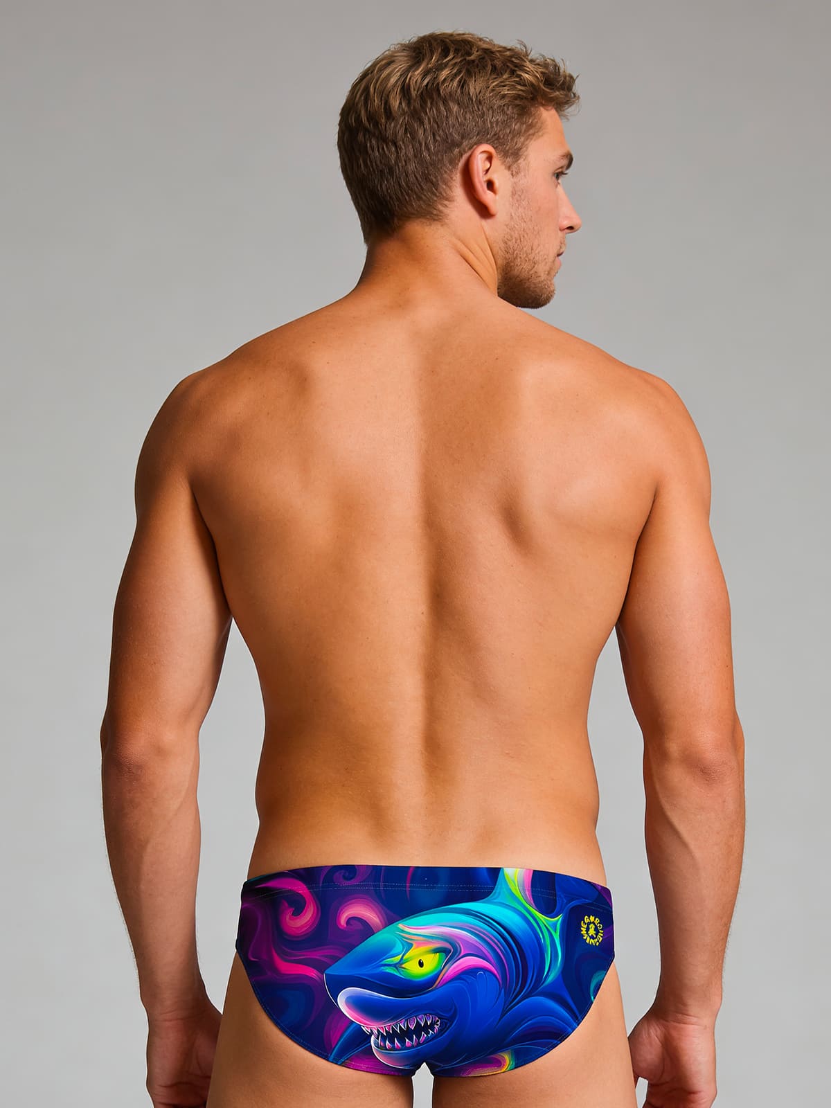 Trainingsslip badpak, model H2otto. Opdruk “Shark wave”: vloeiende lijnen en levendige kleuren, close-up van een haai met een intense blik.