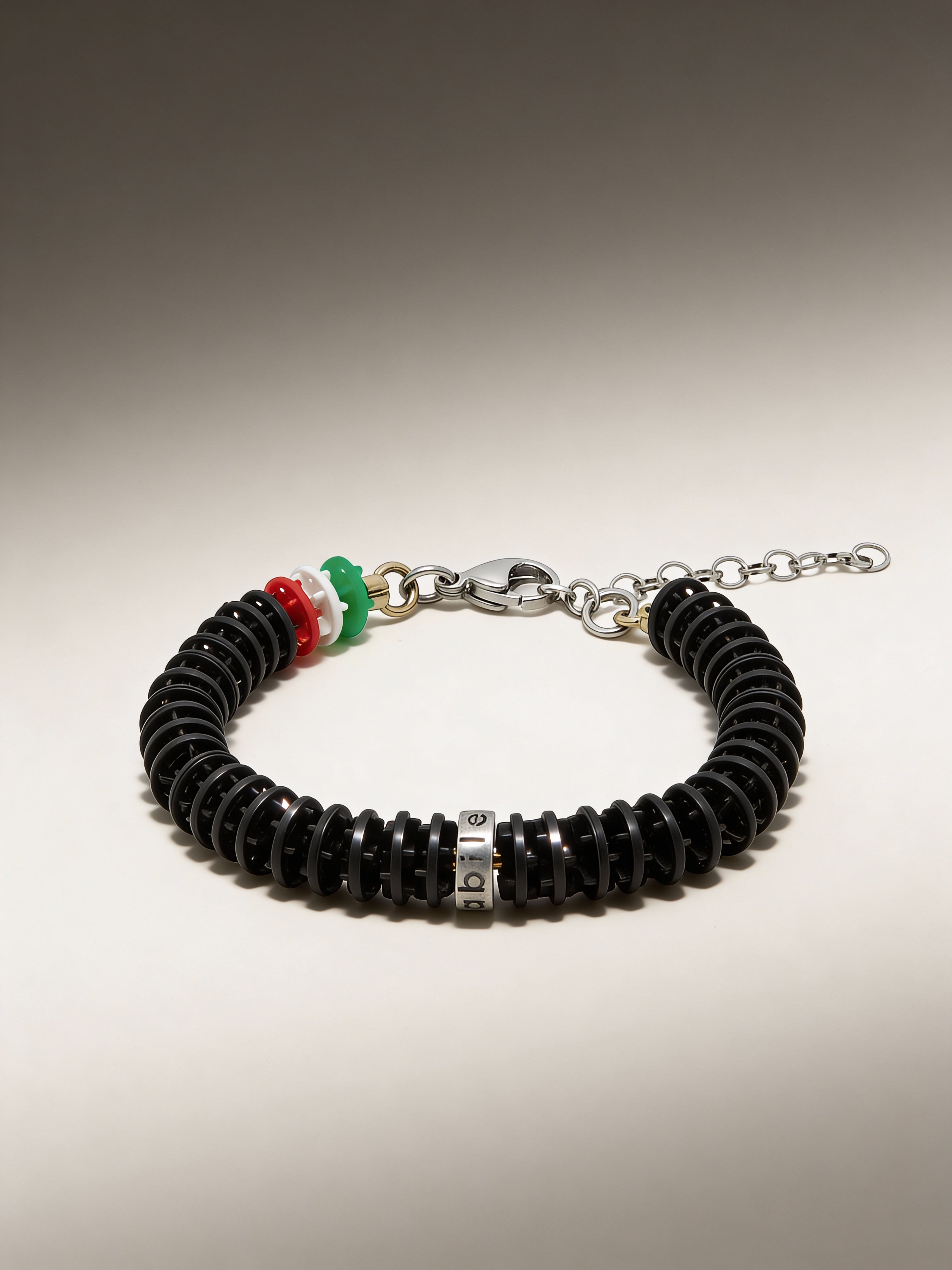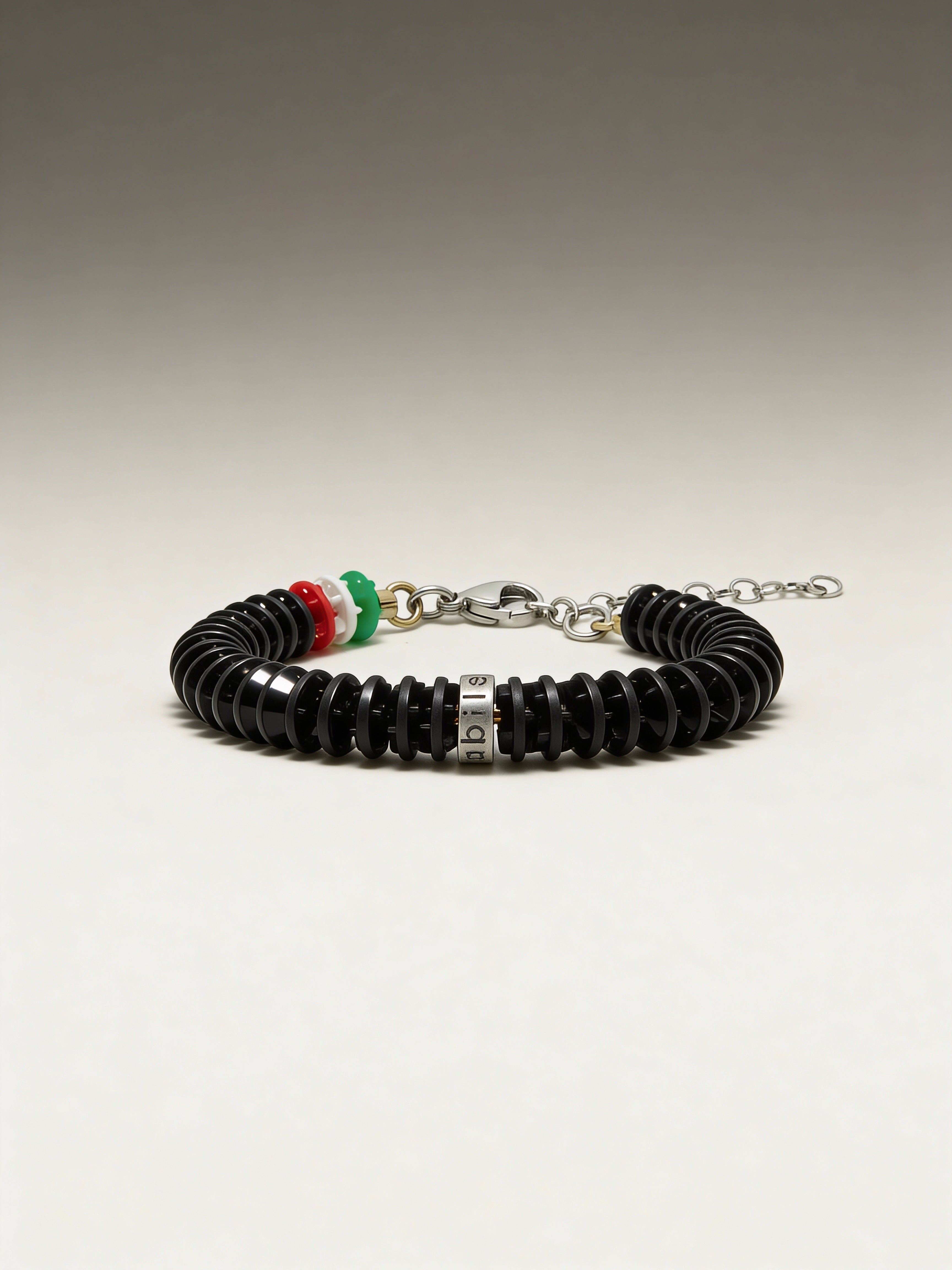 Bracciale Corsia Victory 613 BONESWIMMER: total black essenziale, con una firma tricolore discreta vicino alla chiusura per un contrasto preciso.