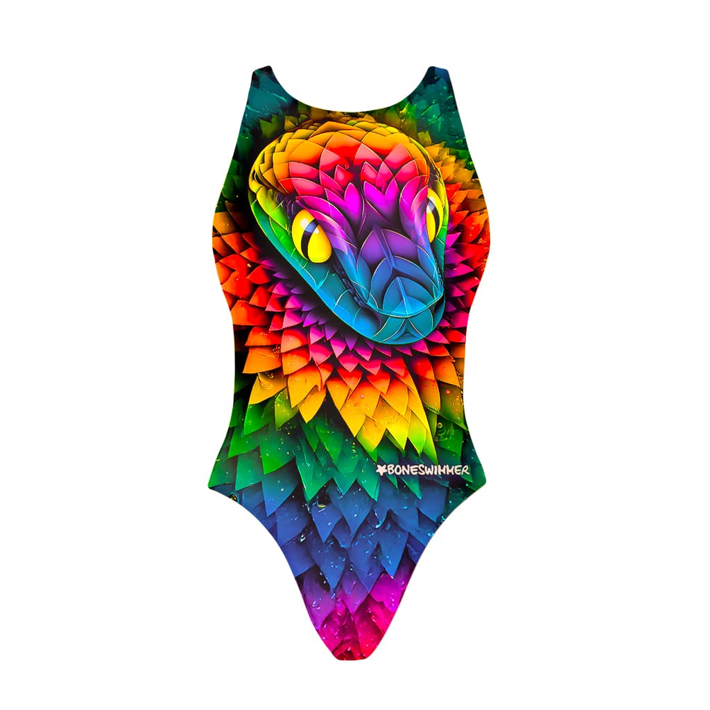 Costume intero da allenamento, modello Pinup. Stampa "Samba": scaglie arcobaleno, sfumature vivide, serpente dallo sguardo intenso.