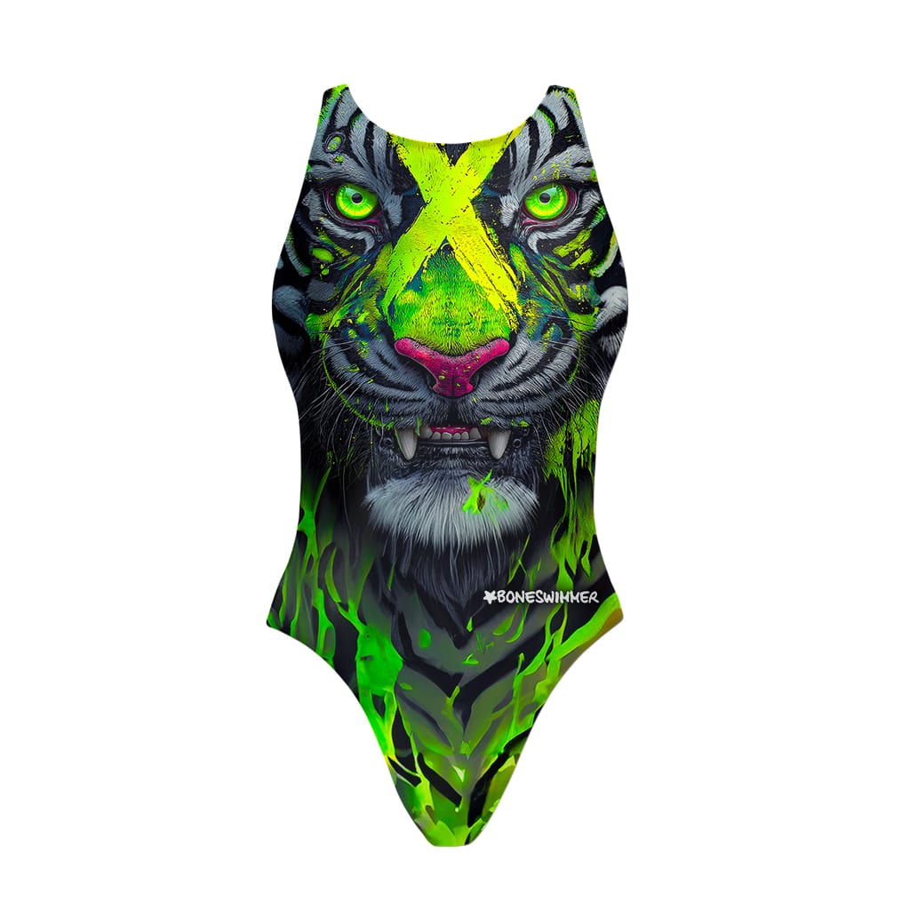 Costume intero da allenamento, modello Pinup. Stampa "Acid": sguardo del predatore, X neon, verde acido su nero - presenza forte, leggibile in vasca.