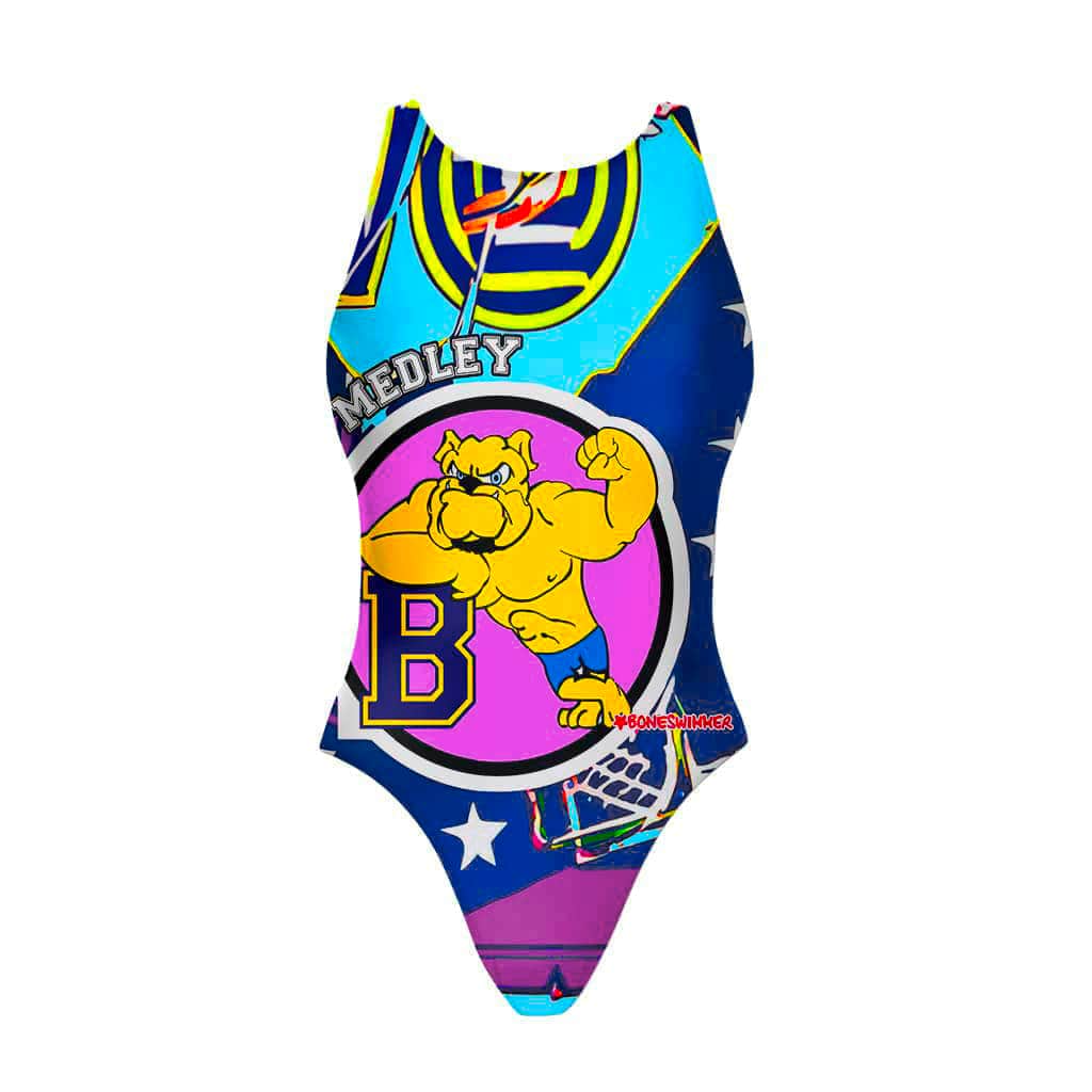 Stile: il PINUP MEDLEY è dedicato a chi nuota in stile misto ed è pensato per le nuotatrici che cercano un mix di resistenza, comfort e stile. Il design sportivo con spalline ergonomiche e schiena aperta assicura massima libertà di movimento e comfort durante le sessioni più impegnative, ma il motivo grafico con l’iconico Bulldog grintoso rende questo costume un capo unico e distintivo, ideale per chi vuole unire performance e carattere.