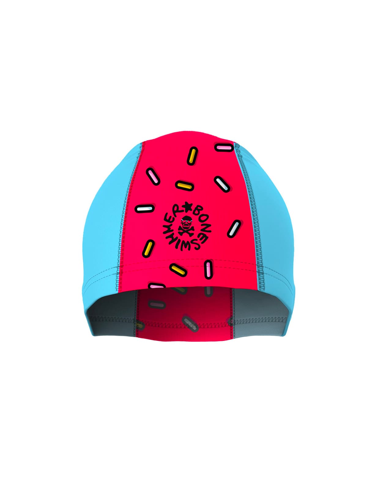 Il contrasto tra l’azzurro brillante del fondo e il fucsia acceso della glassa crea un effetto visivo immediato e accattivante, rendendo il design estremamente riconoscibile e dinamico. Una scelta perfetta per chi ama distinguersi nel nuoto con un accessorio spiritoso e fuori dagli schemi, capace di evocare leggerezza, golosità e un’irriverente voglia di divertimento.