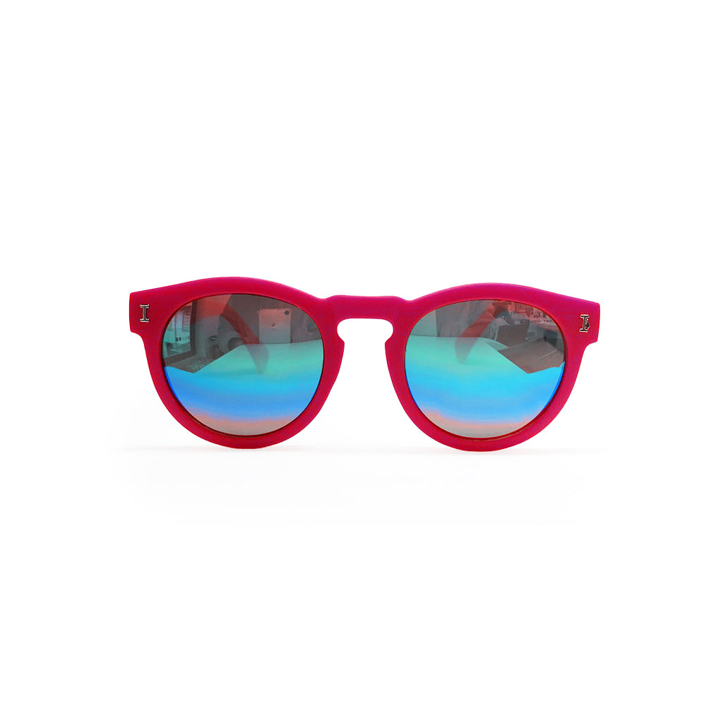 Occhiali da sole con lente blue tonda specchiata e protezione UV400. Trattamento soft touch sulla montatura.