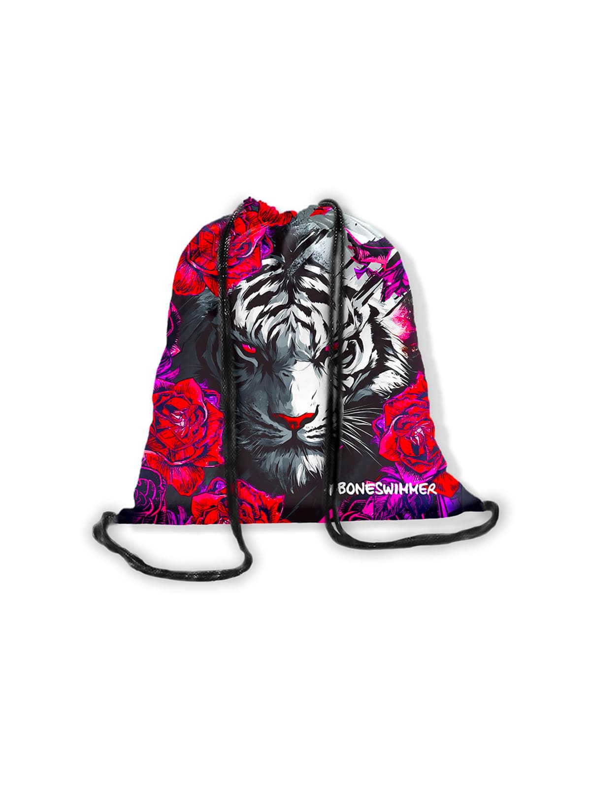 Zainetto sacca in microfibra BONESWIMMER, stampa Tigrosa. Un accessorio versatile e leggero, perfetto per trasportare l'essenziale a bordo vasca con uno stile inconfondibile.
