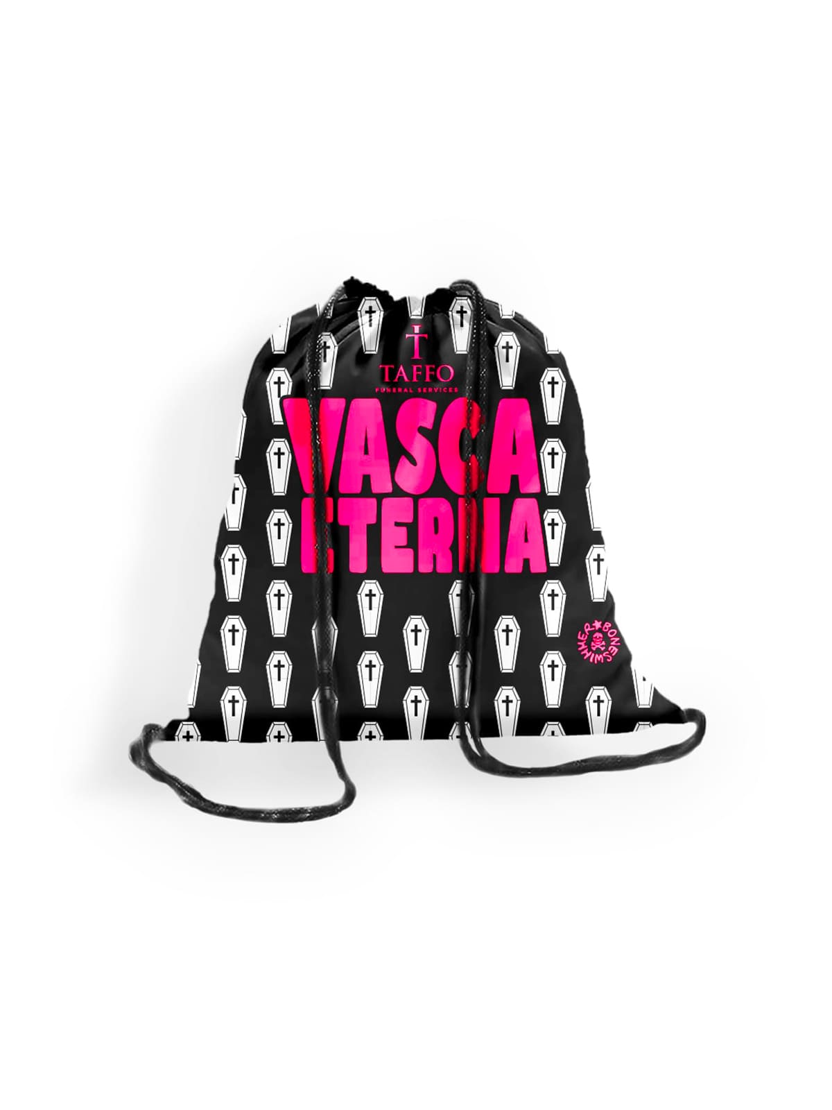 Style: Like all the products created for the Taffo capsule collection, the style is ironic and in this case plays on an elegant black and white graphic pattern. The recurring element is a small stylized coffin, transformed into a distinctive symbol with a strong yet minimal visual impact. The phrase "Eternal Pool" ironically evokes that feeling every swimmer knows, when the pool seems to never end, and at the same time evokes the image of a coffin as a bathtub in which to remain forever. The concept resonates perfectly with the Boneswimmer universe, made up of iconic symbols such as skeletons, skulls, and bones, already part of a unique and recognizable visual tradition. Want to be unconventional to the core, even in your accessories? Choose this microfiber backpack with drawstring closure and shout your ode to life, poking fun at things no one usually dares mention.