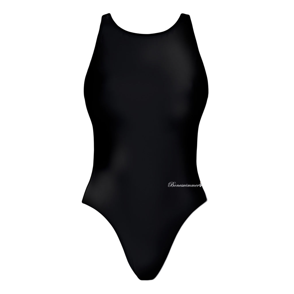 Costume da allenamento nuoto Boneswimmer da donna, modello intero PINUP 237p completamente nero con un piccolo logo discreto sul lato, fronte