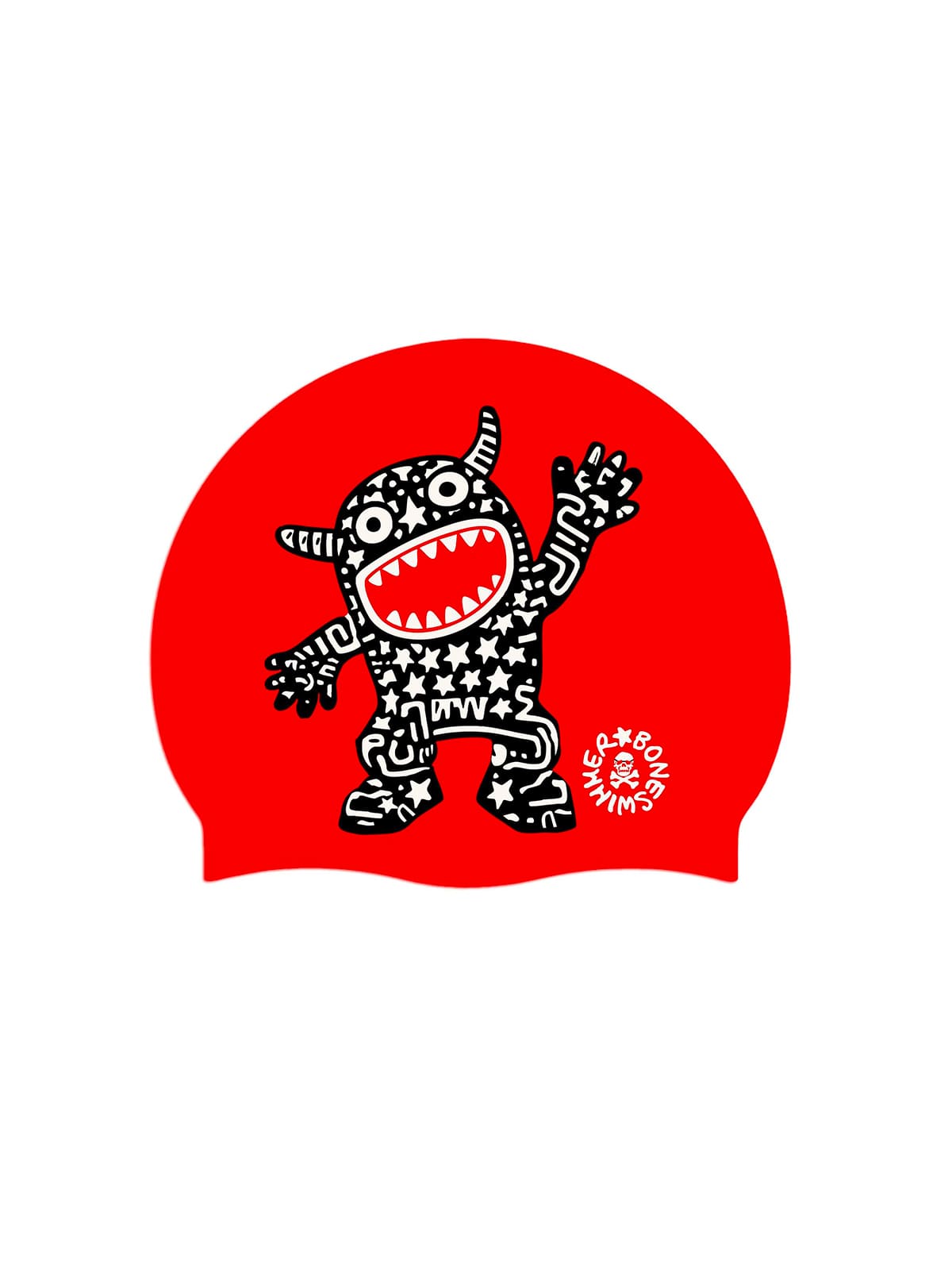 Style: Lively and playful, featuring an illustration of a stylized tribal monster covered in white stars on a black background. The figure, reminiscent of elements of urban art and tribal tattoos, contrasts sharply against the bright red, creating a striking visual effect. The design is dynamic and youthful, conveying energy, originality, and a sense of playful rebellion.