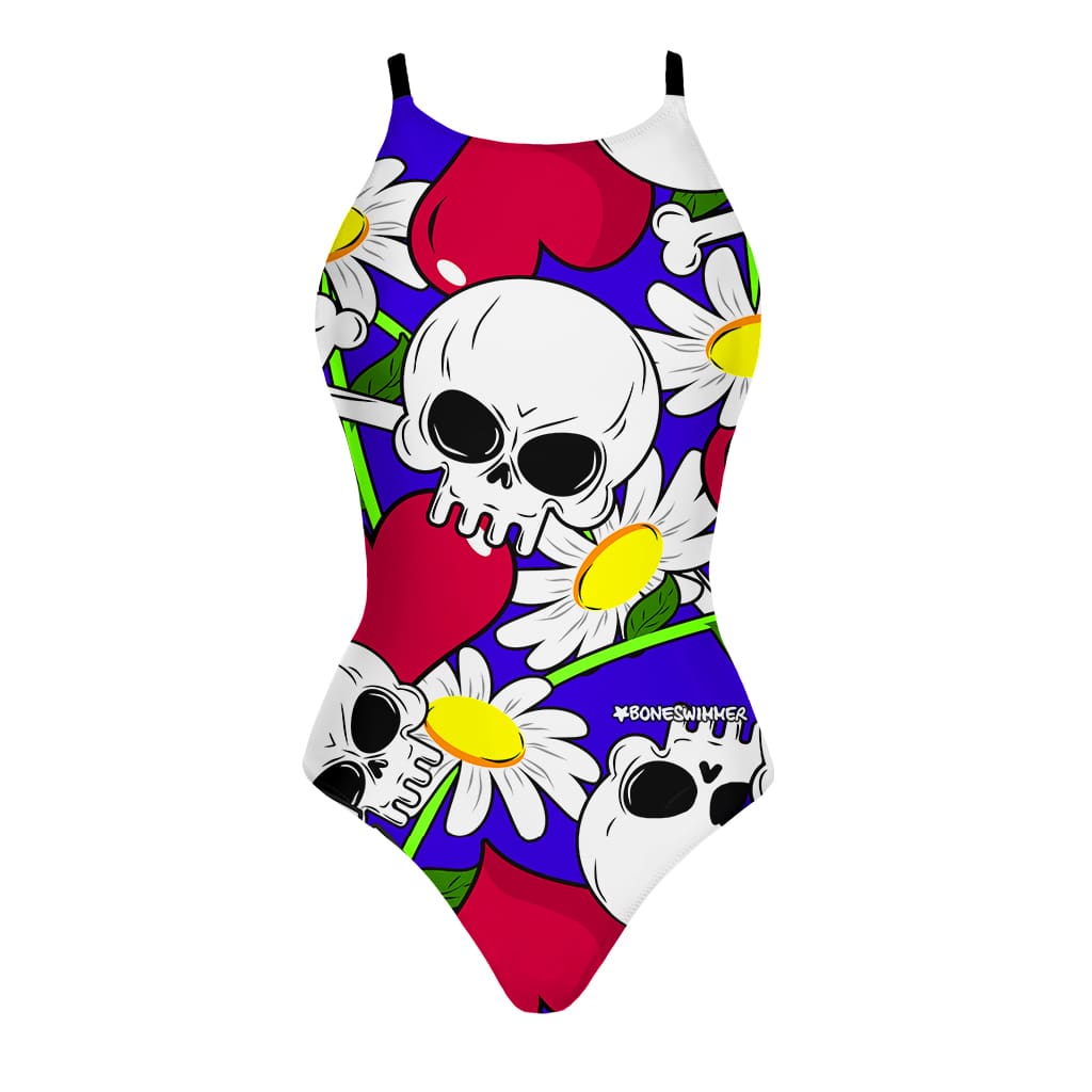 Style : Ce maillot de bain d’entraînement joue avec une esthétique ludique et inattendue , associant des têtes de mort stylisées à des cœurs rouges et des marguerites innocentes sur un fond bleu vibrant. Si vous portez ce maillot, vous révélez une personnalité décontractée qui aime surprendre par une touche d’originalité . Le mélange graphique d’éléments contrastés est parfait pour celles et ceux qui abordent la piscine avec le sourire et une pointe d’ irrévérence , sans pour autant renoncer à leur esprit ludique. Porter ce maillot, c’est apporter un vent de joie et d’originalité dans l’eau.