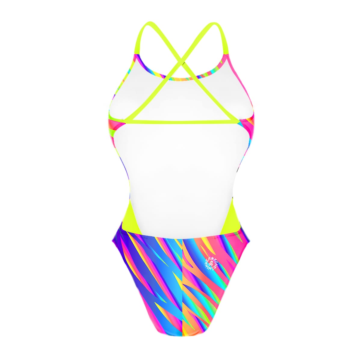 Retro del costume Boneswimmer intero da donna per il tempo libero in piscina, modello ALTE L021AF ROAR con pattern striato multicolor fluo