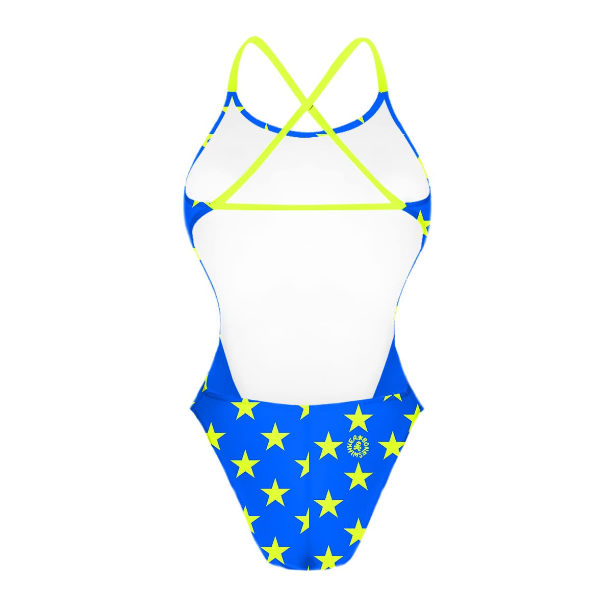Retro del costume Boneswimmer intero da donna per il tempo libero in piscina, modello ALTE L022AF TURCHESE STELLE GIALLE con pattern di stelle gialle fluo