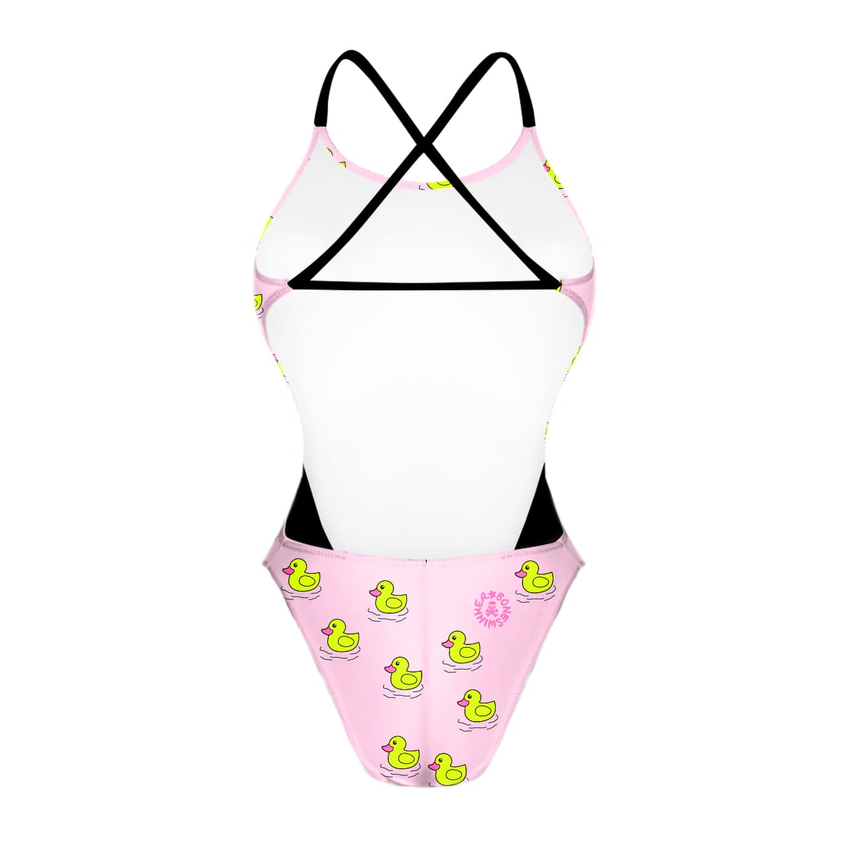 Style : Le design graphique de ce maillot de bain est ludique, amusant et dynamique. Il présente un motif de canards jaunes répété sur un fond rose pâle, rehaussé de détails noirs sur les côtés et les bretelles. Ce style évoque une ambiance fraîche et insouciante, idéale pour celles et ceux qui aiment exprimer leur joie de vivre et leur fantaisie, même dans leurs tenues de sport. Portez ce maillot de bain pour exprimer votre côté fun, jeune et anticonformiste, et révéler une personnalité à la fois douce et légèrement impertinente. Il est parfait pour celles et ceux qui souhaitent se démarquer avec originalité et fantaisie, sans sacrifier le confort et la praticité à la piscine ou à la plage.