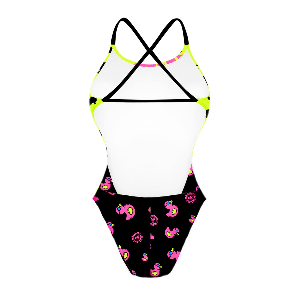 Fronte del costume Boneswimmer intero da donna per il tempo libero in piscina, modello ALTE L031AF DUXY con una papera rosa su fondo giallo fluo