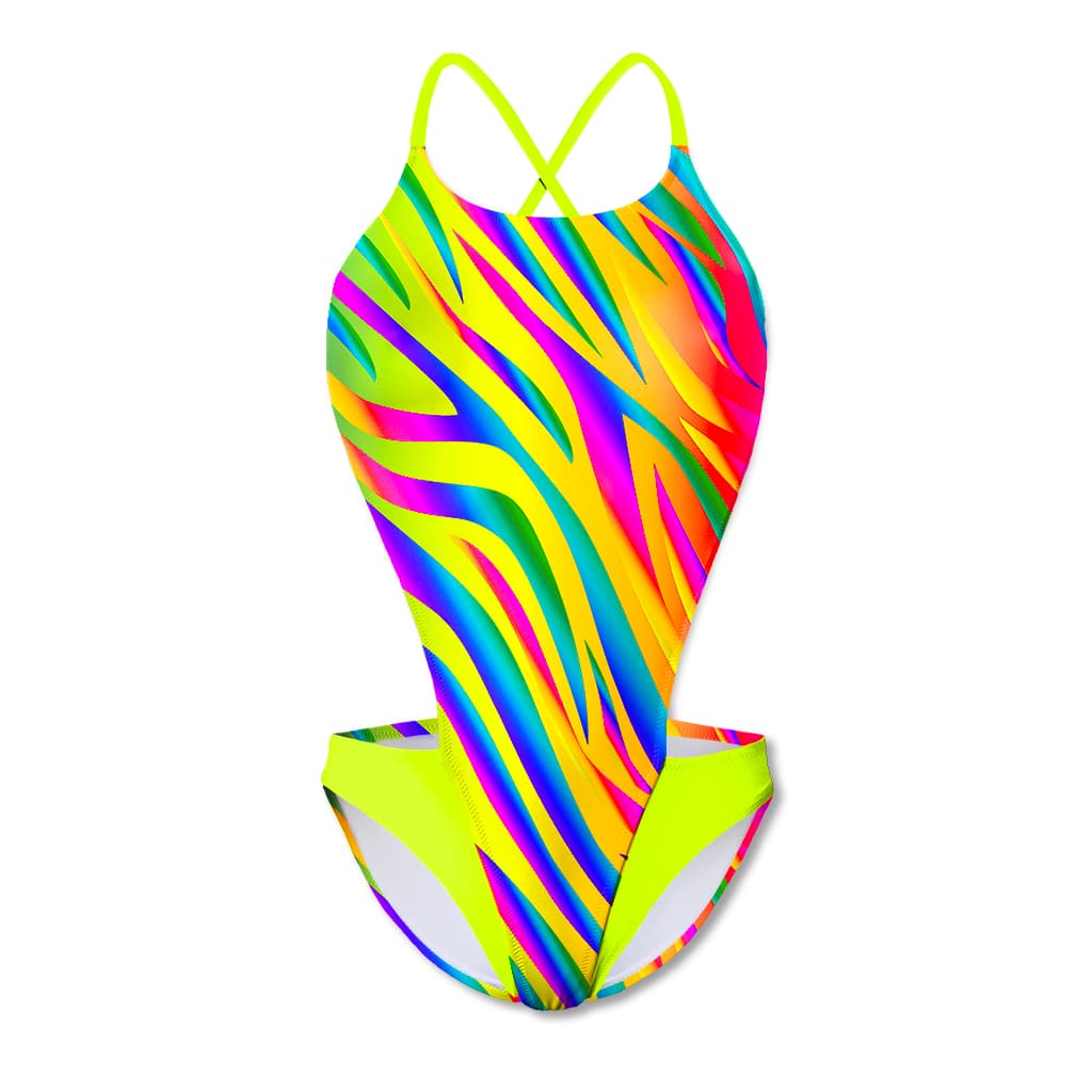 Costume intero modello Boneswimmer DEGA L021DF ROAR, adatto al nuoto nel tempo libero, con fantasia zabrata multicolore fluo