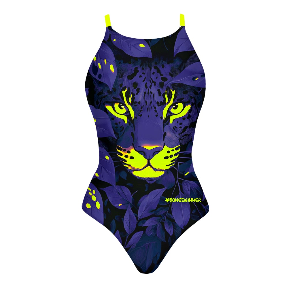 Costume Boneswimmer intero da donna per l'allenamento in piscina, modello IBIZA GLOW con un giagurao in ambientazione notturna tra le foglie e segni fluo sul muso; vista frontale