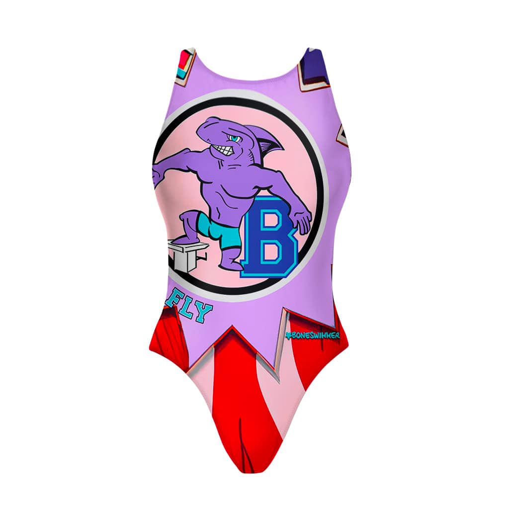 Costume Boneswimmer intero da donna per l'allenamento in piscina, modello PINUP FLY con un delfino agguerrito che si tuffa; vista posteriore