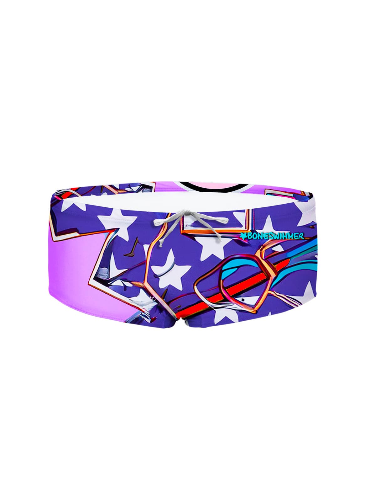Style : Dynamique et ludique, ce t-shirt mêle éléments sportifs et graphisme pop dans un esprit universitaire américain. L’avant arbore des nuances de violet et de lilas, rehaussées d’étoiles blanches stylisées et de motifs géométriques pour un effet dynamique. Au dos, on retrouve le motif principal : un dauphin anthropomorphe lilas, sympathique et musclé, vêtu d’un short bleu et prêt à plonger du plot de départ, accompagné du mot « Fly », une référence évidente à la nage en papillon. Le graphisme, avec son style audacieux et caricatural, rappelle les mascottes des écoles américaines.