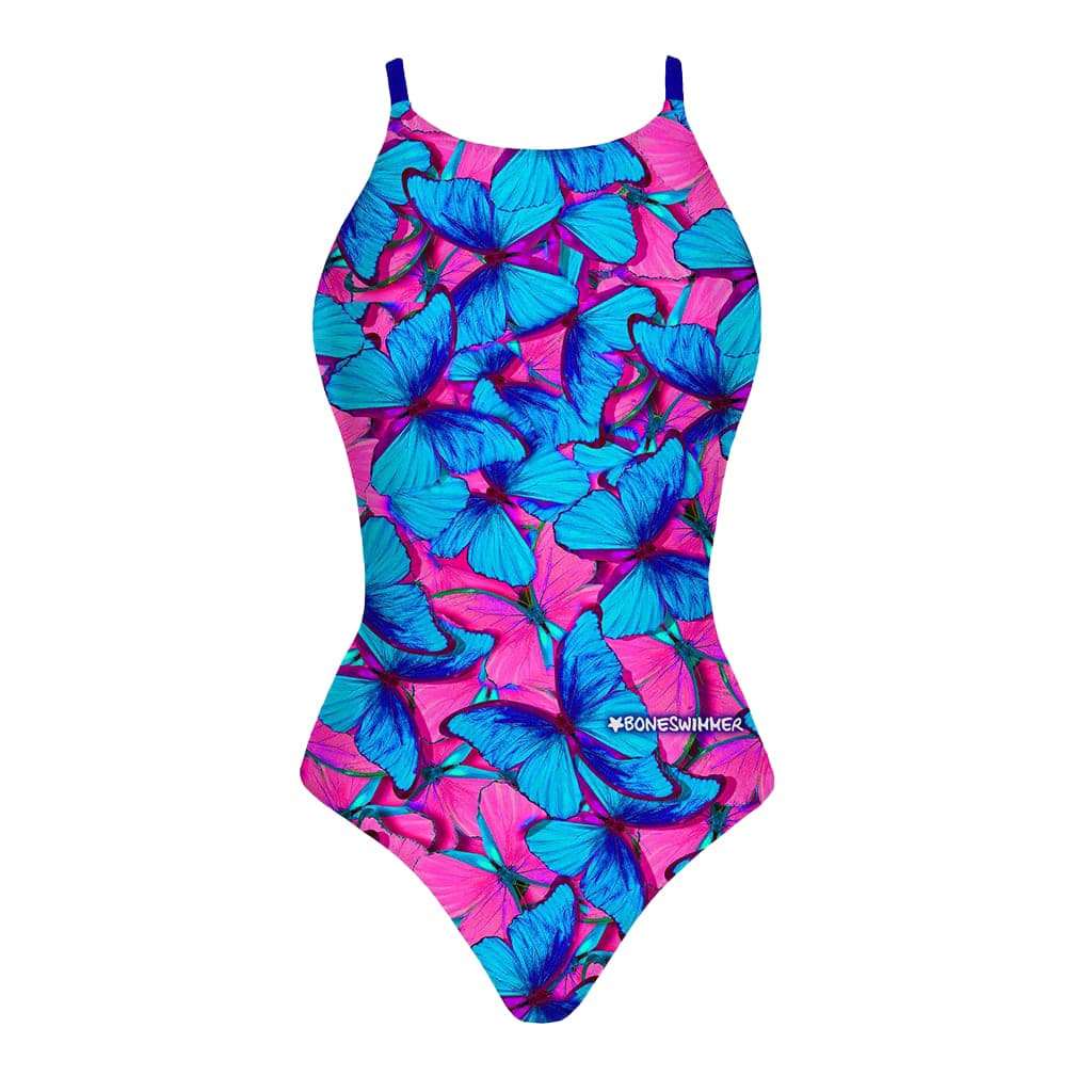 Costume da allenamento nuoto Boneswimmer da donna, modello intero IBIZA 148if SETA con stampa di farfalle rosa fluo e azzurro, fronte