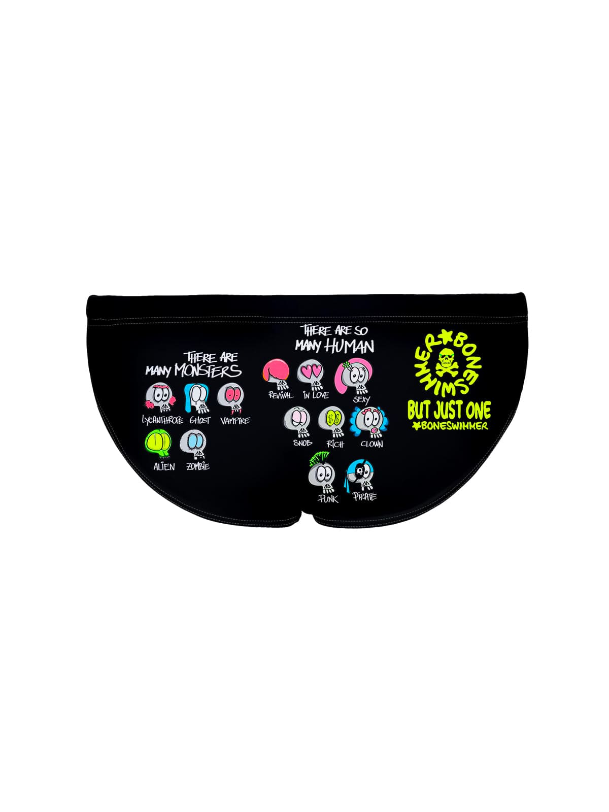 Stile: modello originale e irriverente, con la grafica in stile cartoon, gioca con una serie di piccole illustrazioni di teschi stilizzati che rappresentano diversi “umani” e “mostri”: dall’alieno allo zombie, dal vampiro al clown, fino a figure ironiche come “sexy” e “funk”. Su sfondo nero intenso, le scritte bianche e i dettagli al neon – giallo fluo, verde acido, rosa shocking – creano un contrasto vivace e di forte impatto visivo. Perfetto per chi ama lo stile alternativo e desidera unire performance e personalità, trasformando ogni sessione di allenamento in un momento unico.